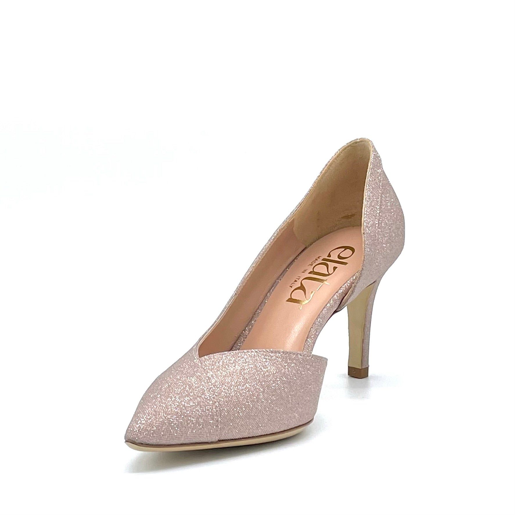 Décolleté in tessuto glitter rosa e apertura laterale. Fodera in pelle, suola in cuoio. Altezza tacco 7,5 cm.