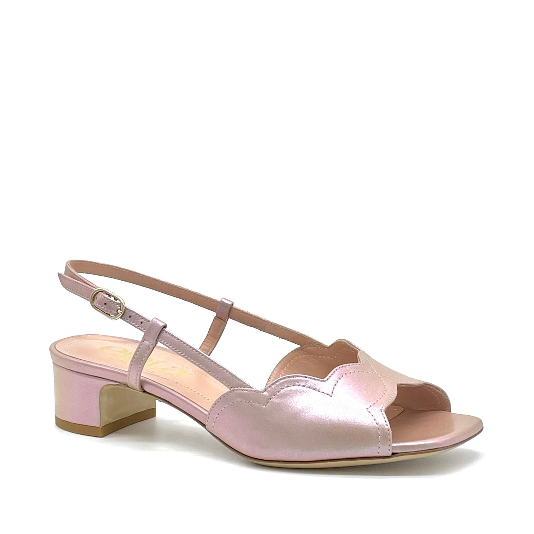 Sandalo in pelle cangiante rosa. Fodera in pelle, suola in cuoio. Altezza tacco 3,5 cm.