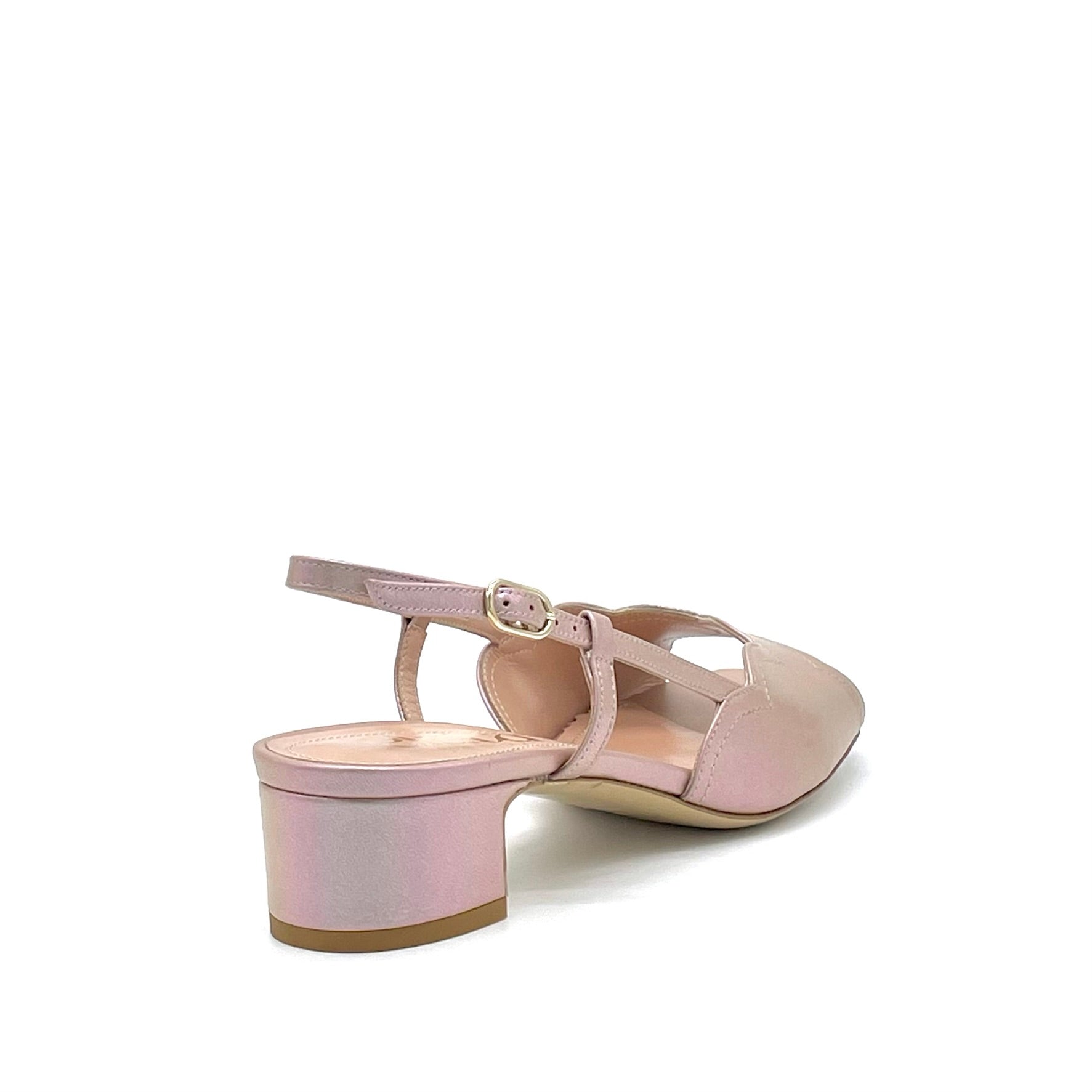 Sandalo in pelle cangiante rosa. Fodera in pelle, suola in cuoio. Altezza tacco 3,5 cm.