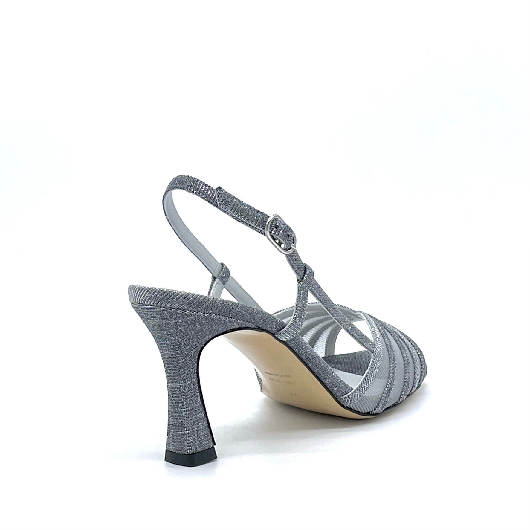Sandalo in tessuto laminato acciaio e inserti in rete. Fodera in pelle, suola in cuoio. Altezza tacco 7,5 cm.