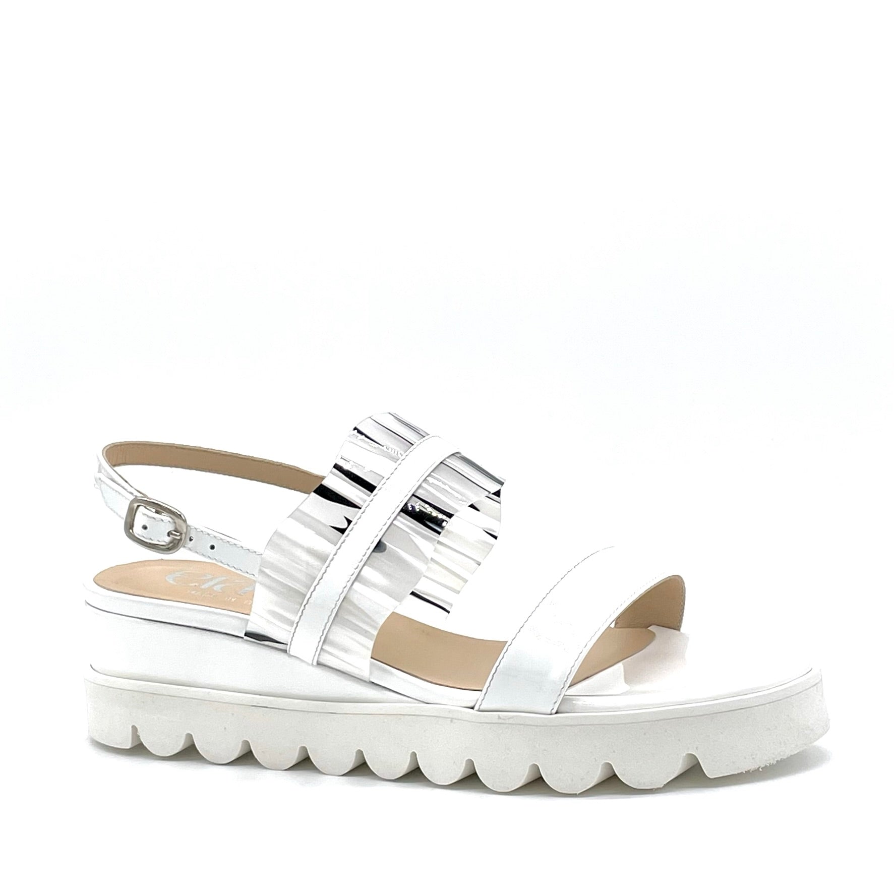 Sandalo in vernice bianca e vinile black and white. Fodera in pelle, zeppa rivestita in vernice e suola in gomma. Altezza tacco 5 cm.