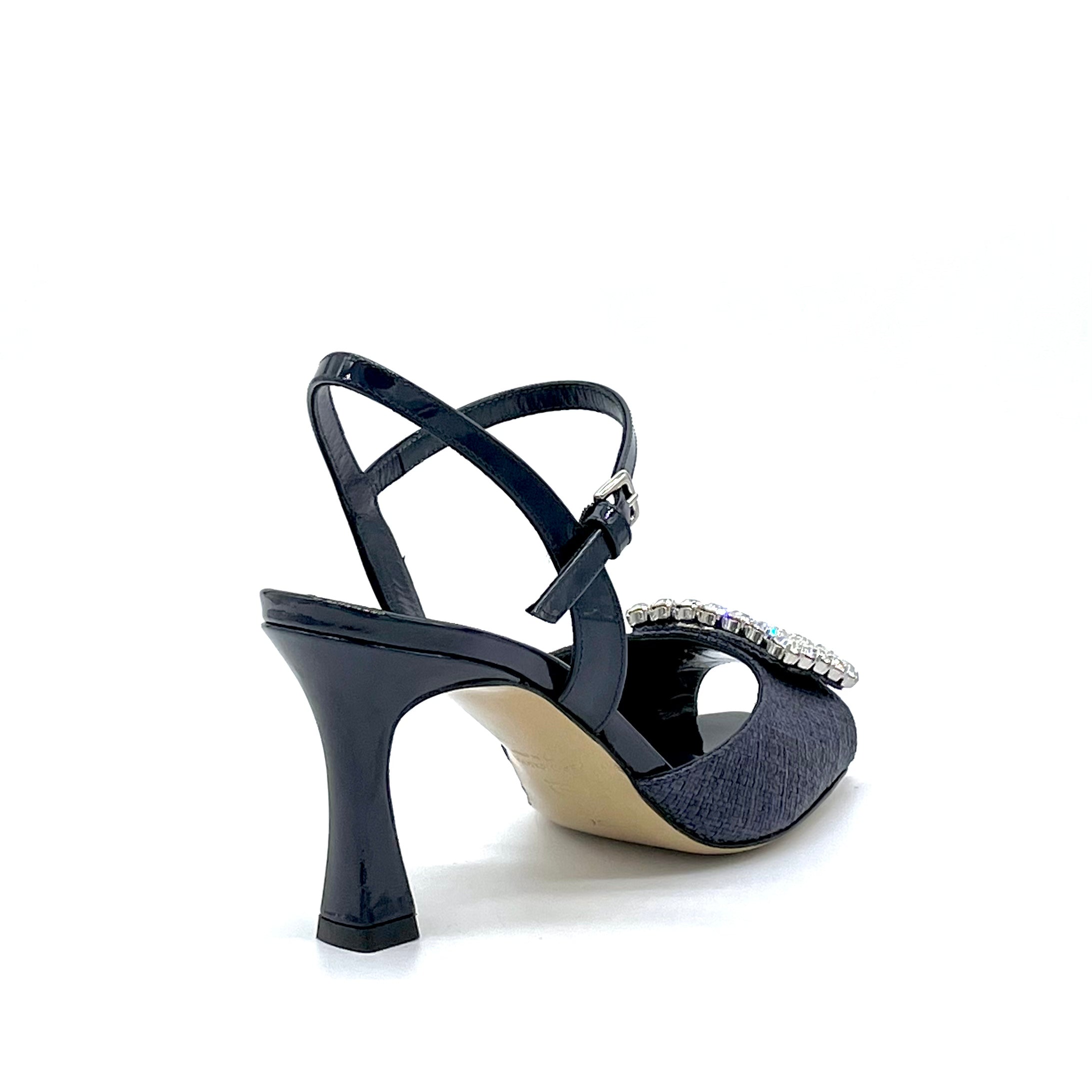 Sandalo in vernice e tessuto di rafia blu con fibbia gioiello. Fodera in pelle, suola in cuoio. Altezza tacco 7,5 cm.