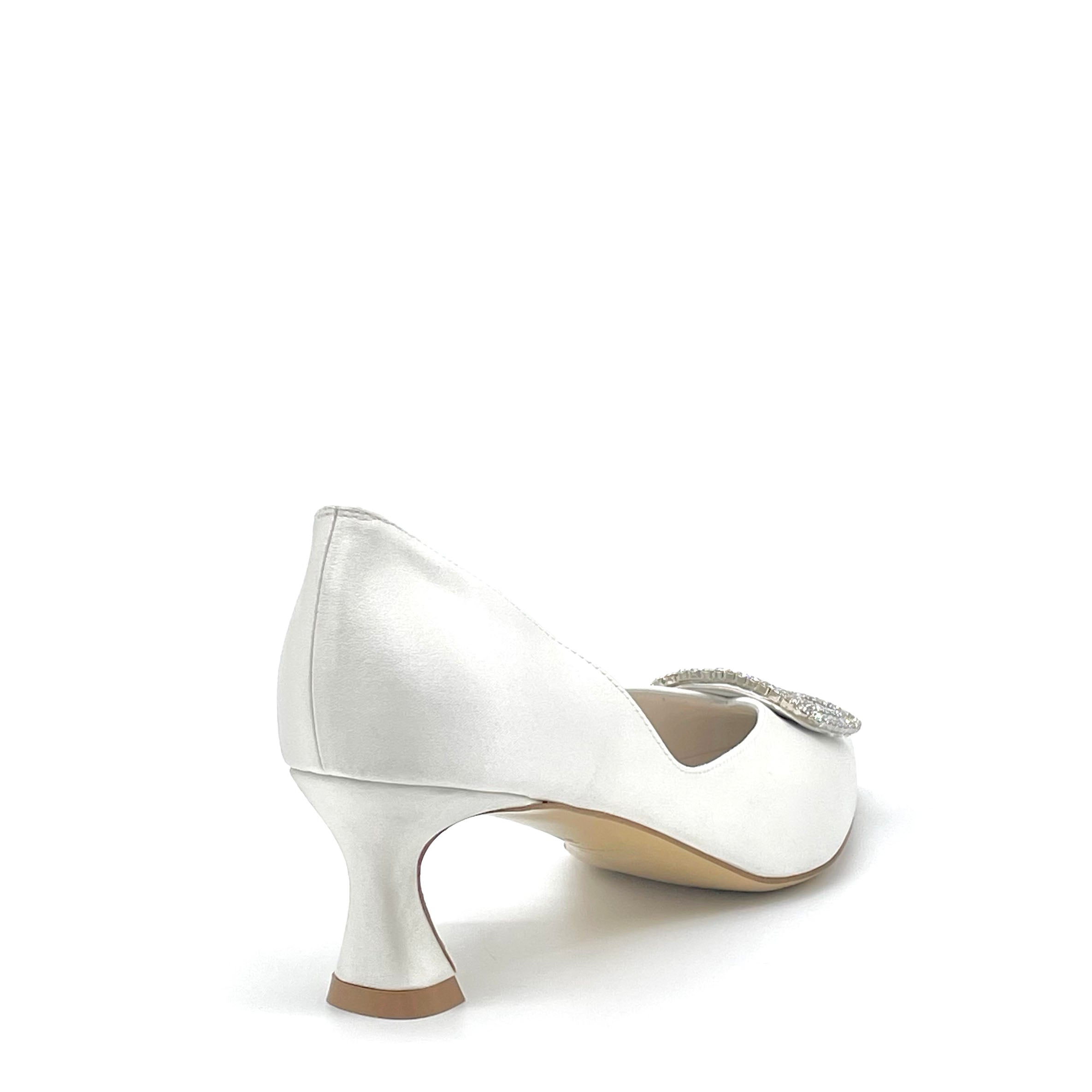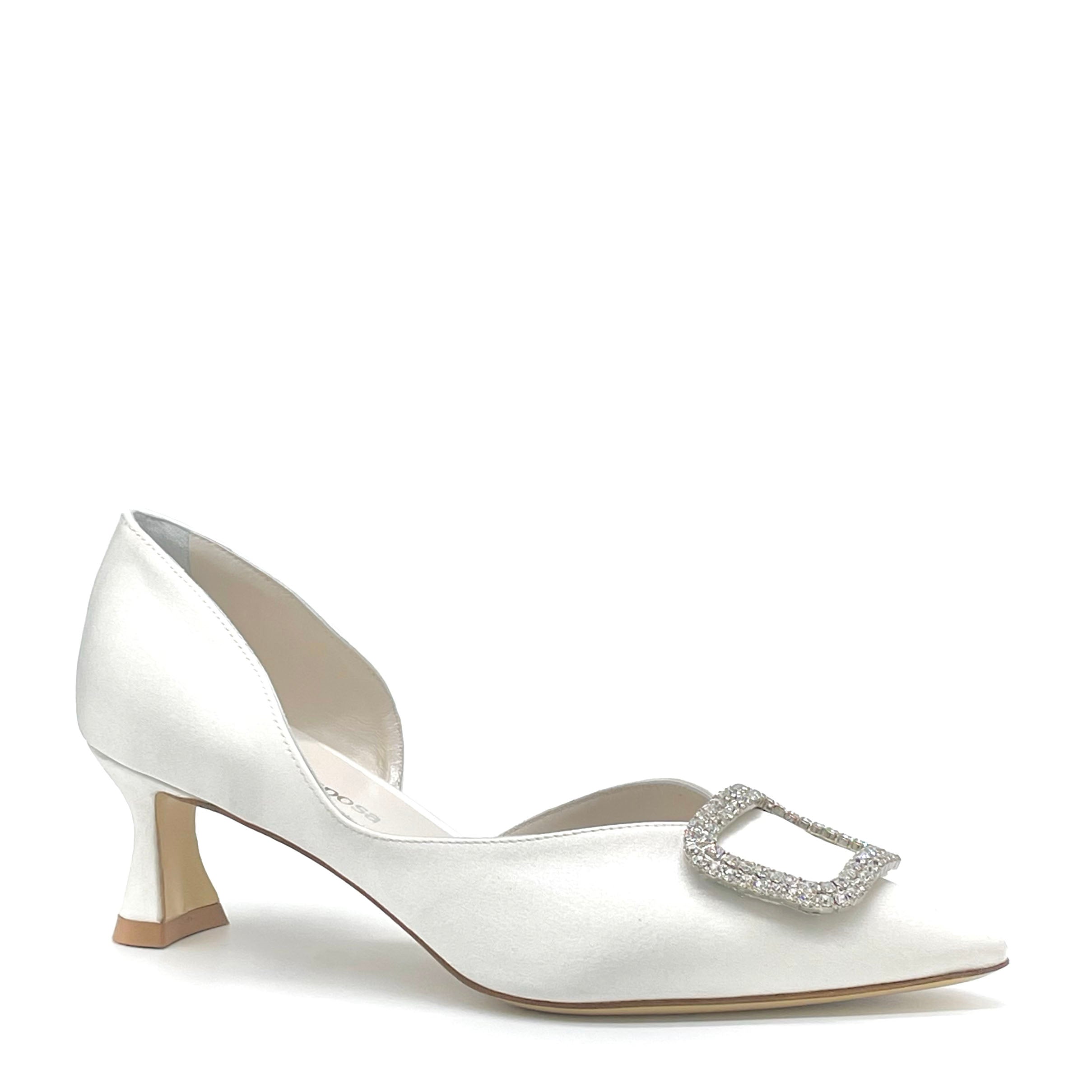 Décolleté in raso di seta bianco con fibbia gioiello e apertura laterale. Fodera in pelle, suola in cuoio. Altezza tacco 5,5 cm.