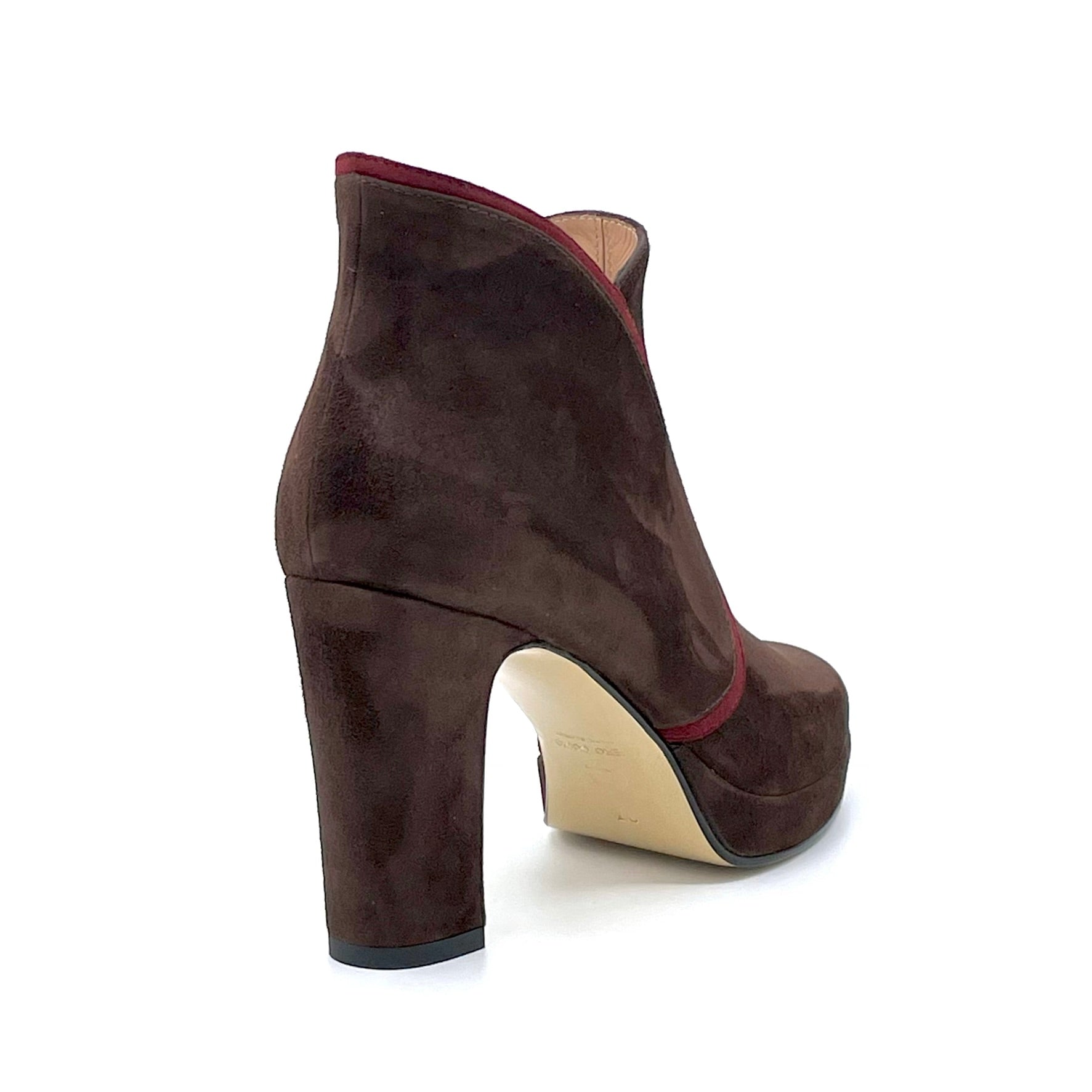 Tronchetto in camoscio marrone e rosso scuro. Fodera in pelle, suola in cuoio e gomma. Altezza tacco 9,5 cm plateau 2 cm.