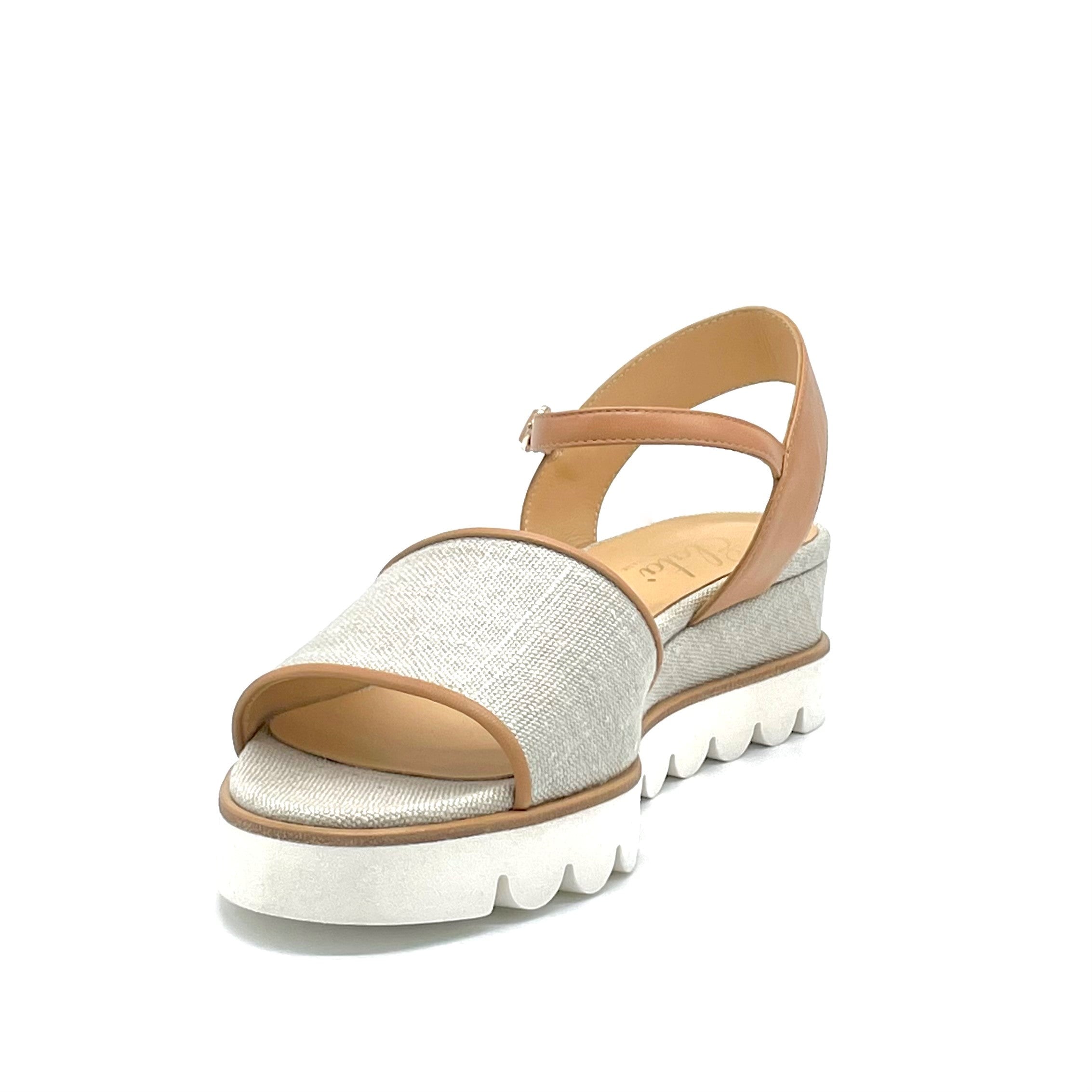 Rope colour fabric and dark beige leather sandal. Leather lining, fabric covered wedge and rubber sole. 5 cm heel.