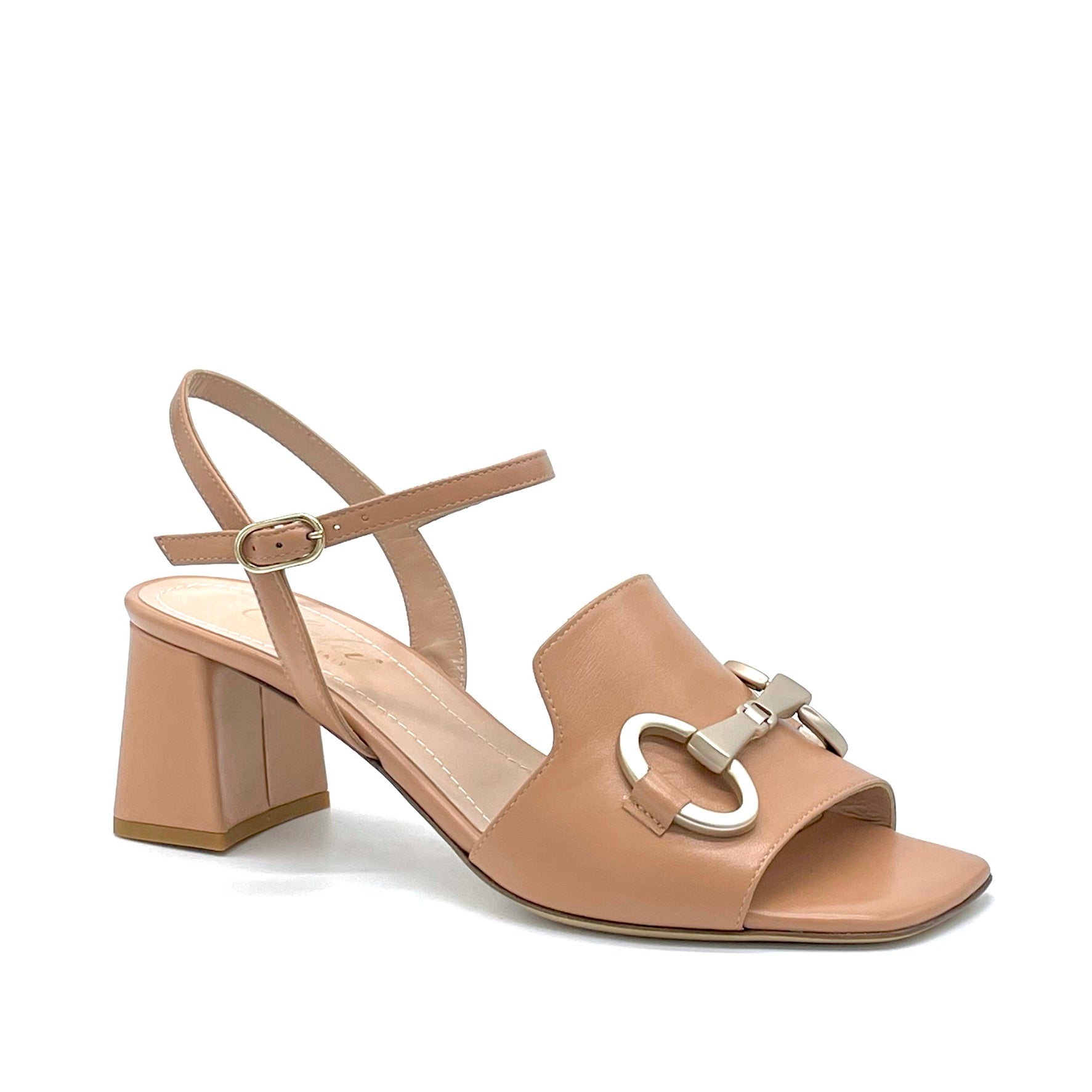 Sandalo in pelle color cuoio con morsetto oro satinato. Fodera in pelle, suola in cuoio. Altezza tacco 5,5 cm.