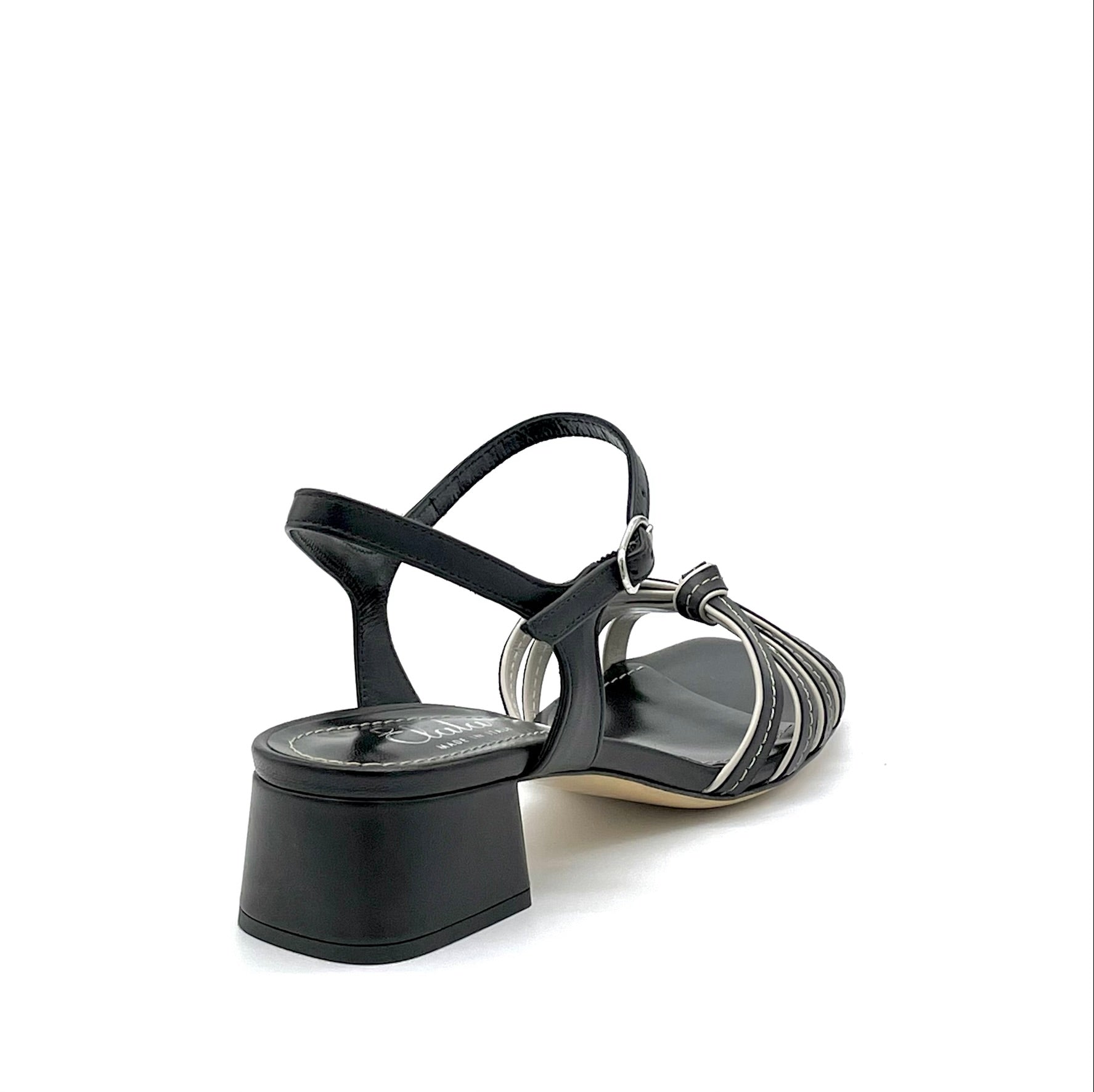 Sandalo in pelle nera e bianca con fascette annodate. Fodera in pelle. Suola in cuoio. Altezza tacco 3,5 cm.