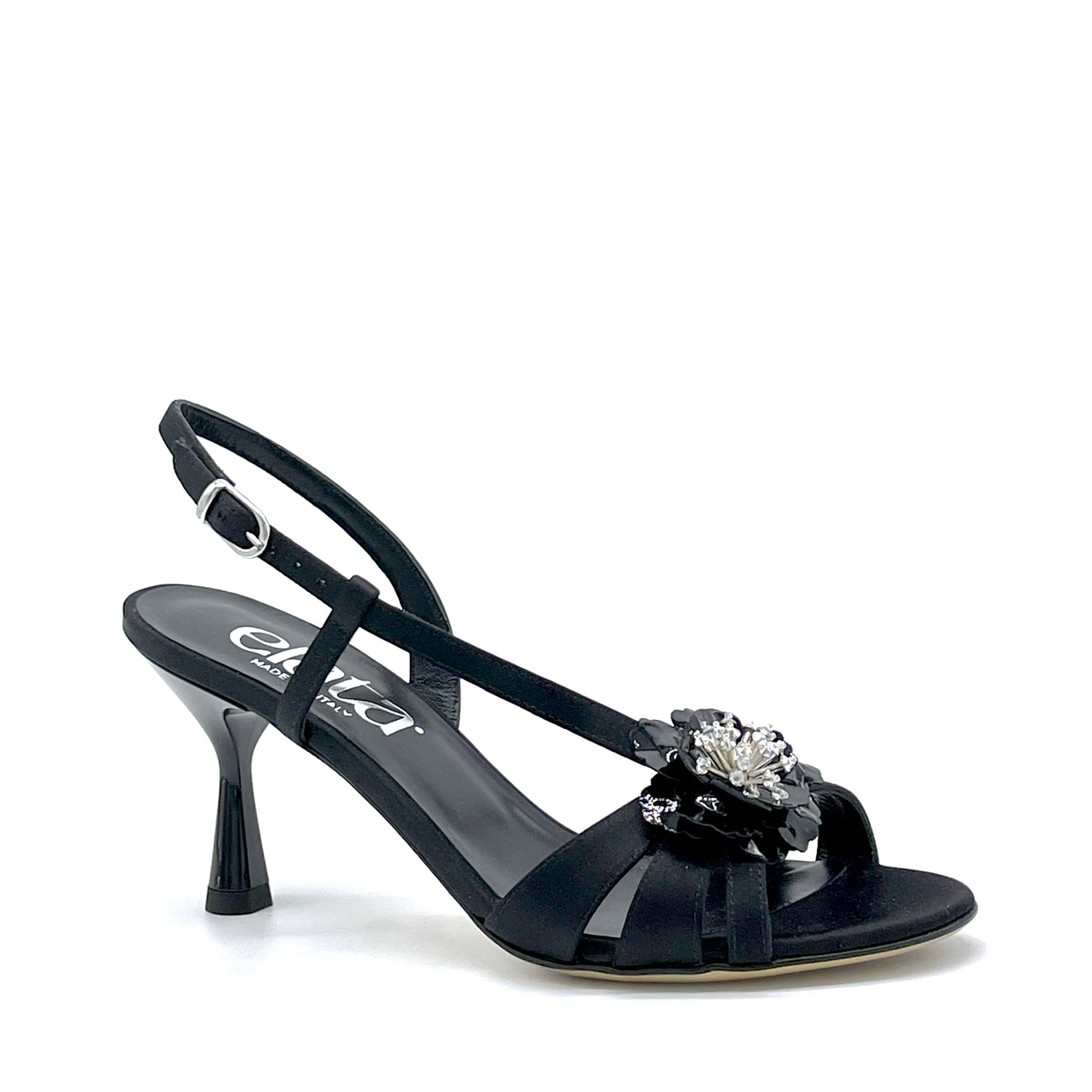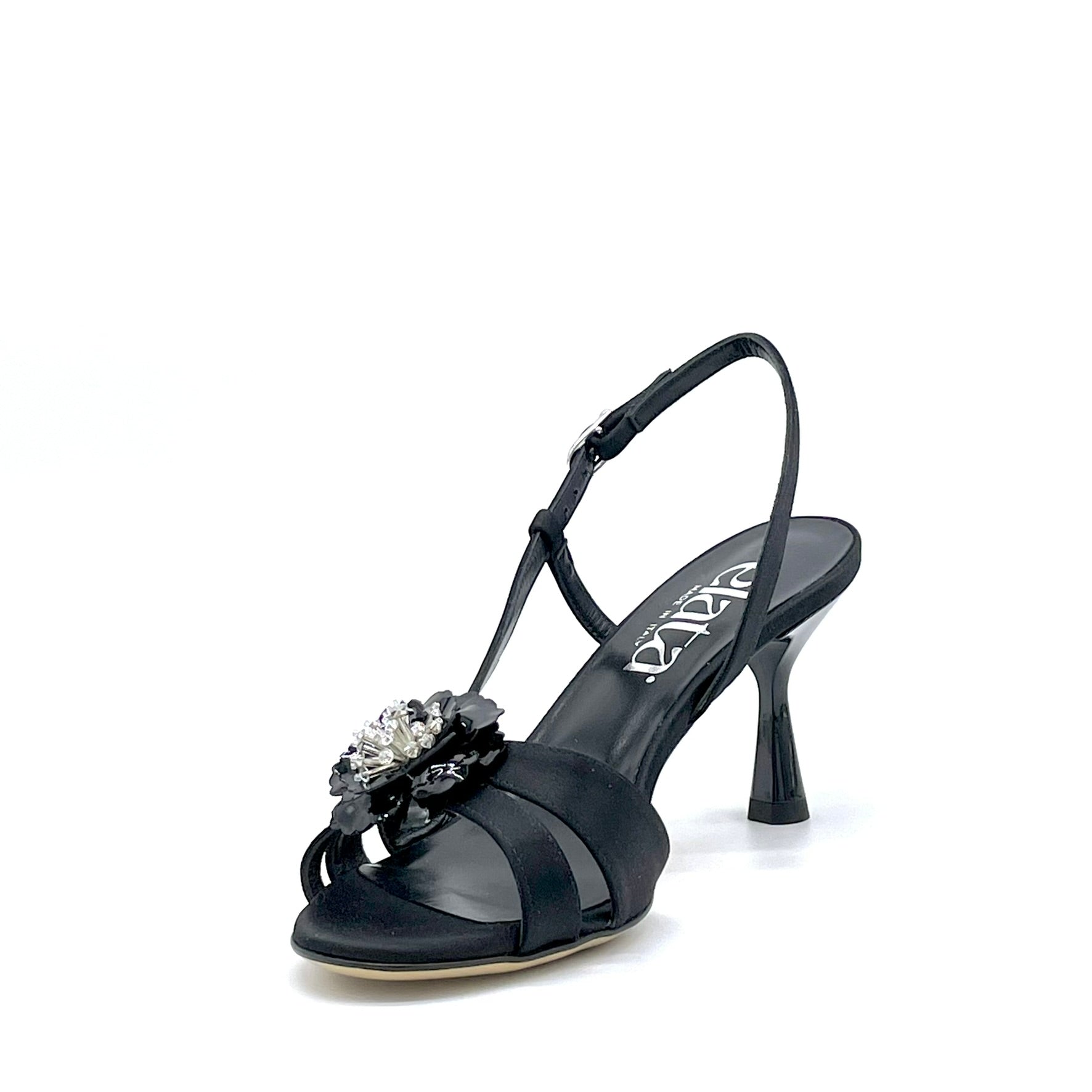 Sandalo in raso di seta nero e accessorio floreale in vernice – Cod. 16121