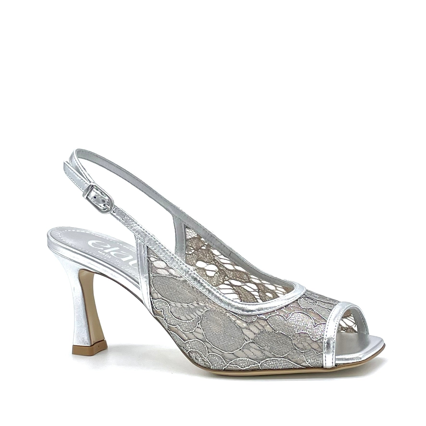 Sandalo in rete di pizzo e inserti in pelle laminata argento. Fodera in rete, suola in cuoio. Altezza tacco 7,5 cm.