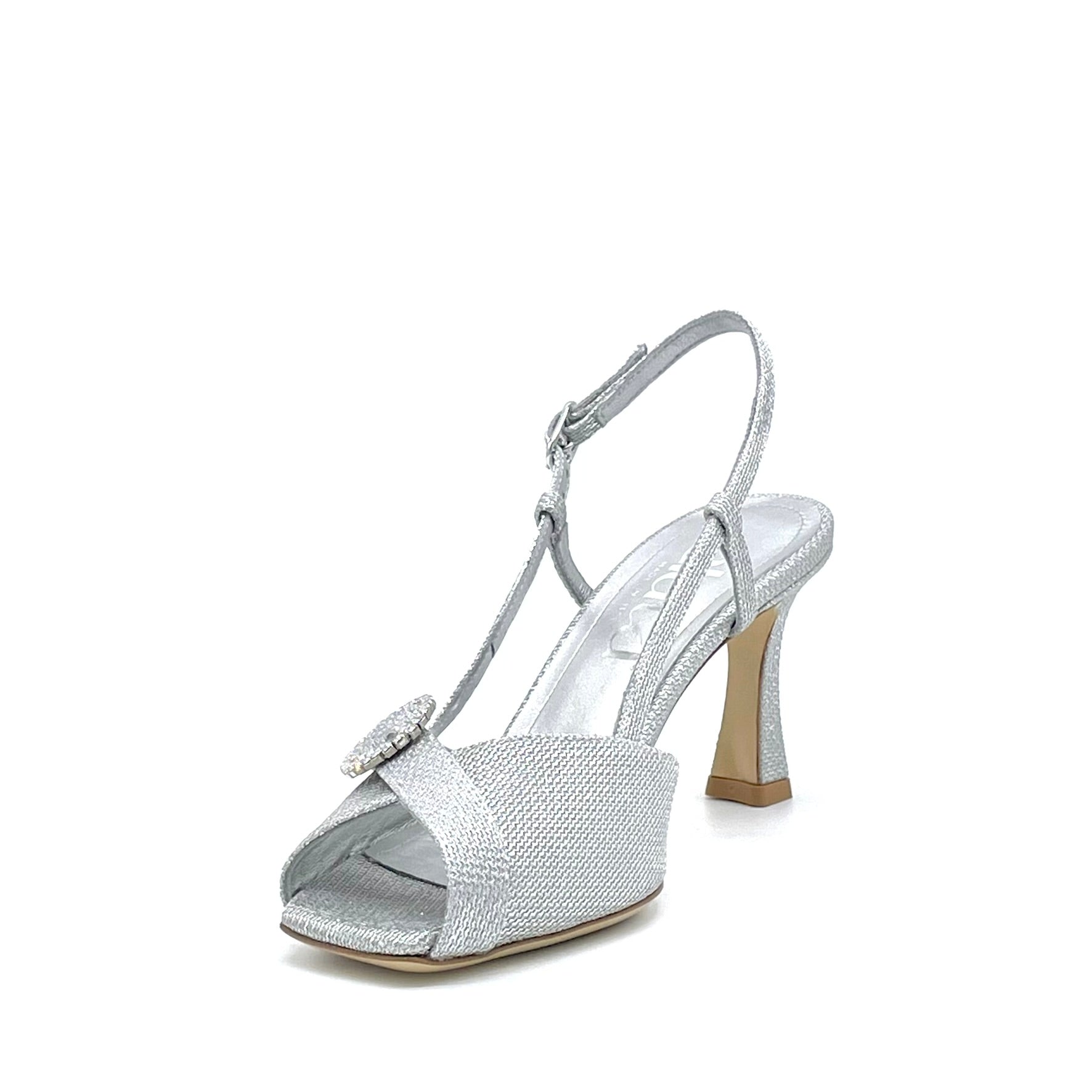 Sandalo in tessuto laminato argento e fibbia gioiello. Fodera in pelle ,suola in cuoio. Altezza tacco 7,5 cm.