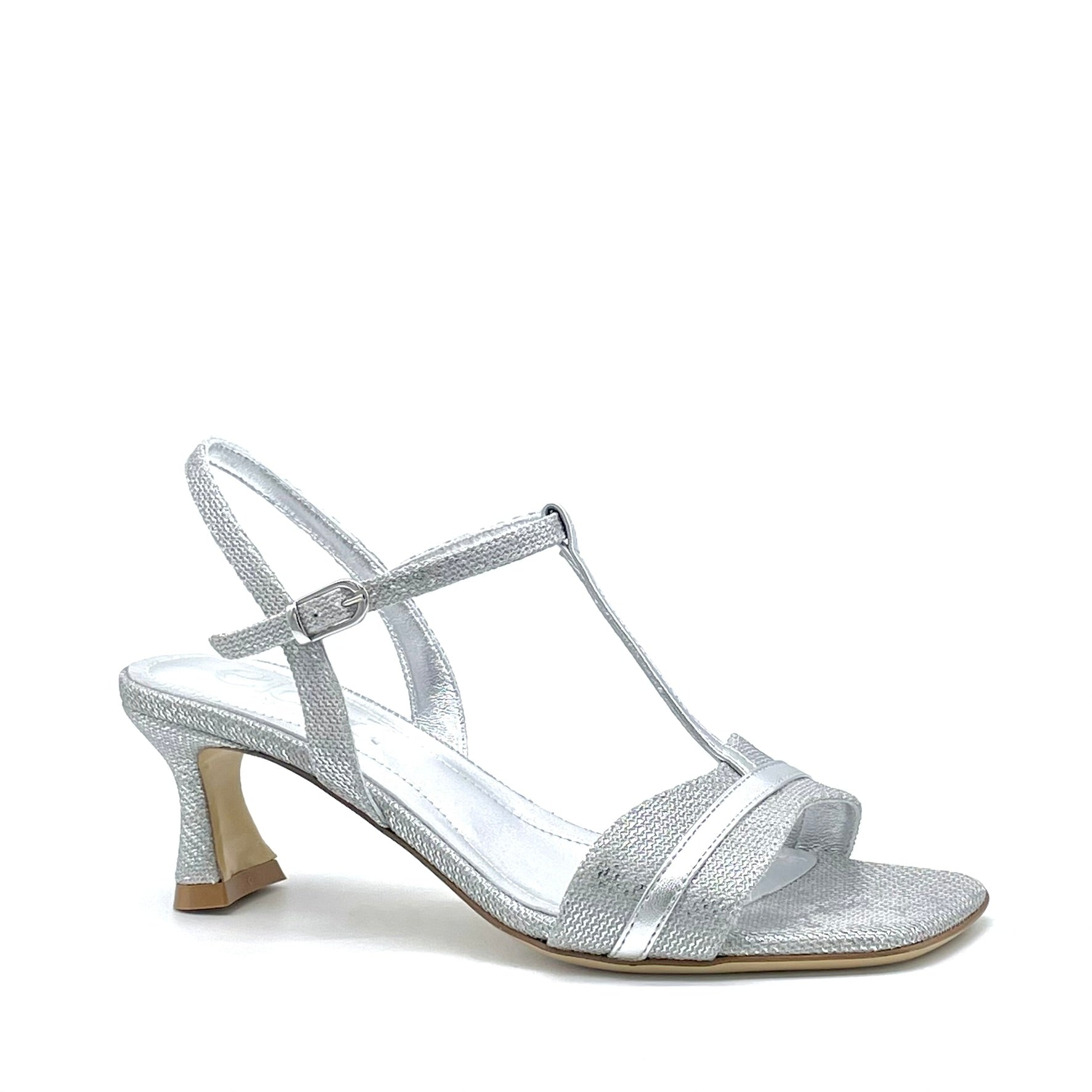 Sandalo in tessuto laminato e pelle laminata argento – Cod. 16108